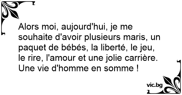 Alors moi, aujourd'hui, je me souhaite d'avoir plusieurs maris, un paquet de bébés, la liberté, le jeu, le rire, l'amour et une jolie carrière. Une vie d'homme en somme !