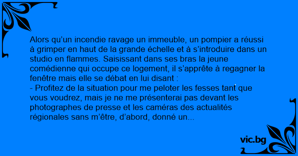Alors qu’un incendie ravage un immeuble, un pompier a réussi à grimper en haut de la grande échelle et à s’introduire dans un studio en flammes. Saisissant dans ses bras la jeune comédienne qui occupe ce logement, il s’apprête à regagner la fenêtre mais elle se débat en lui disant :