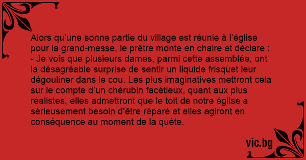 - Je vois que plusieurs dames, parmi cette assemblée, ont la désagréable surprise de sentir un liquide frisquet leur dégouliner dans le cou. Les plus imaginatives mettront cela sur le compte d’un chérubin facétieux, quant aux plus réalistes, elles admettront que le toit de notre église a sérieusement besoin d’être réparé et elles agiront en conséquence au moment de la quête.