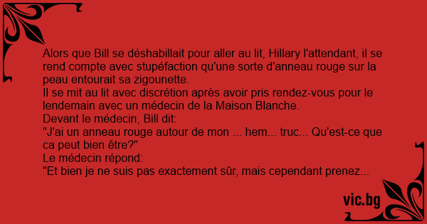 While undressing for bed one night, Bill Clinton notices a red rash around his "thing." Alarmed, he thinks, "I can't let Hillary see this!", and makes a point of getting to his doctor at Bethesda Naval Hospital, the very next day. "Doc," he says,...