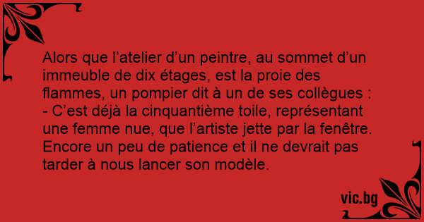 Alors que l’atelier d’un peintre, au sommet d’un immeuble de dix étages, est la proie des flammes, un pompier dit à un de ses collègues :