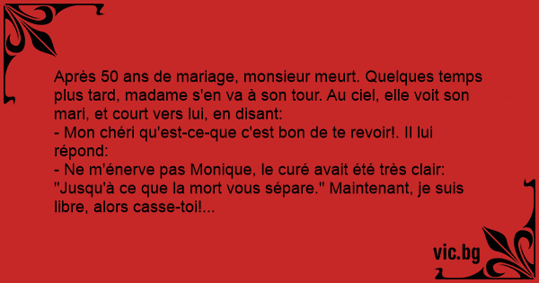 Dupa 50 de ani de casnicie el moare. La scurt timp moare si ea si ajunge in rai unde-l vede pe el. - Dragule, ce bine-mi pare sa te regasesc! - Lasa-ma-n pace! Contractul a fost foarte clar: "Pana...