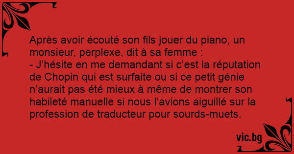 - J’hésite en me demandant si c’est la réputation de Chopin qui est surfaite ou si ce petit génie n’aurait pas été mieux à même de montrer son habileté manuelle si nous l’avions aiguillé sur la profession de traducteur pour sourds-muets.