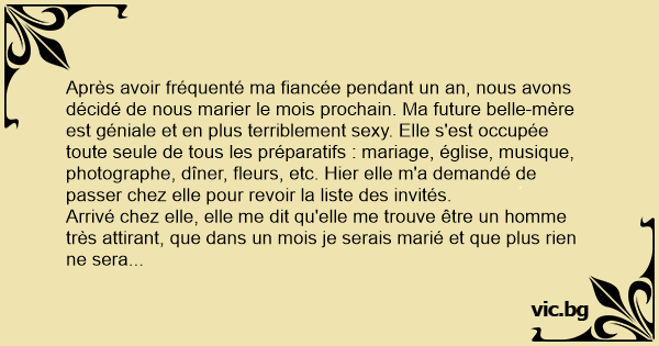 Après avoir fréquenté ma fiancée pendant un an, nous avons décidé de nous marier le mois prochain. Ma future belle-mère est géniale et en plus terriblement sеxy. Elle s'est occupée toute seule de tous les préparatifs : mariage, église, musique, photographe, dîner, fleurs, etc. Hier elle m'a demandé de passer chez elle pour revoir la liste des invités.