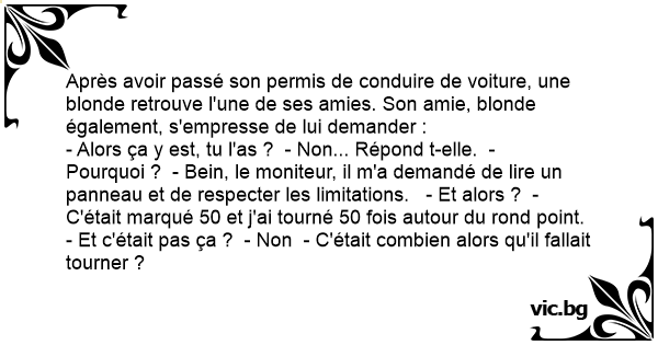 - Alors ça y est, tu l'as ? - Non... Répond t-elle. - Pourquoi ? - Bein, le moniteur, il m'a demandé de lire un panneau et de respecter les limitations. - Et alors ? - C'était marqué 50 et j'ai tourné 50 fois autour du rond point. - Et c'était pas ça ? - Non - C'était combien alors qu'il fallait tourner ?