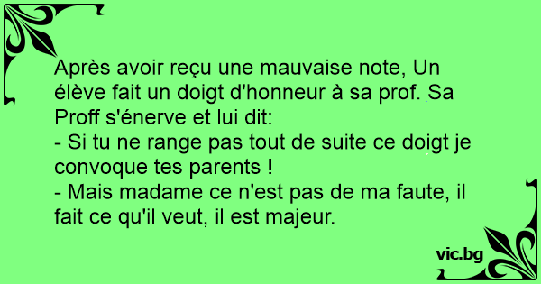 Après avoir reçu une mauvaise note, Un élève fait un doigt d'honneur à sa prof. Sa Proff s'énerve et lui dit: