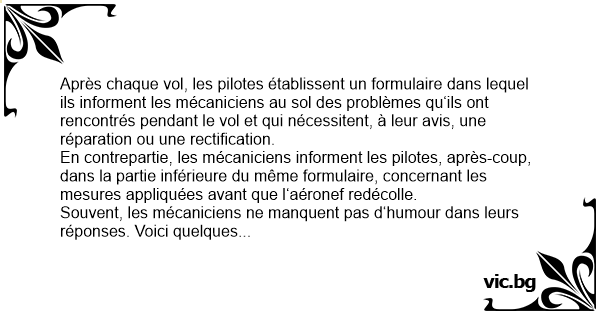 Souvent, les mécaniciens ne manquent pas d‘humour dans leurs réponses. Voici quelques remarques authentiques apposées par les pilotes des compagnies aériennes sur ces formulaires, confrontées aux réponses respectives des mécaniciens.