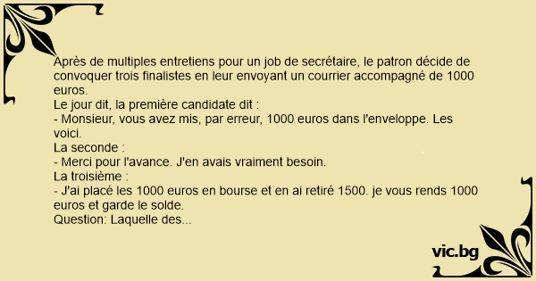 Après de multiples entretiens pour un job de secrétaire, le patron décide de convoquer trois finalistes en leur envoyant un courrier accompagné de 1000 euros.