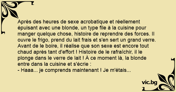 Après des heures de sexe acrobatique et réellement épuisant avec une blonde, un type file à la cuisine pour manger quelque chose, histoire de reprendre des forces. Il ouvre le frigo, prend du lait frais et s'en sert un grand verre. Avant de le boire, il réalise que son sexe est encore tout chaud après tant d'effort ! Histoire de le rafraîchir, il le plonge dans le verre de lait ! À ce moment là, la blonde entre dans la cuisine et s'écrie :