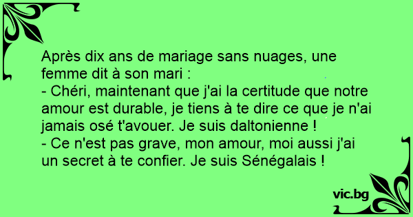 - Chéri, maintenant que j'ai la certitude que notre amour est durable, je tiens à te dire ce que je n'ai jamais osé t'avouer. Je suis daltonienne !