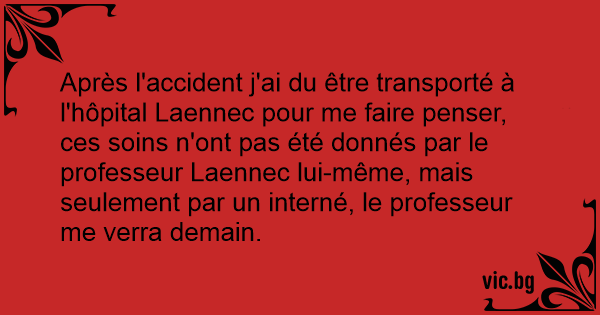 Après l'accident j'ai du être transporté à l'hôpital Laennec pour me faire penser, ces soins n'ont pas été donnés par le professeur Laennec lui-même, mais seulement par un interné, le professeur me verra demain.