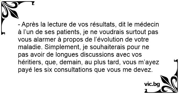 - Après la lecture de vos résultats, dit le médecin à l’un de ses patients, je ne voudrais surtout pas vous alarmer à propos de l’évolution de votre maladie. Simplement, je souhaiterais pour ne pas avoir de longues discussions avec vos héritiers, que, demain, au plus таrd, vous m’ayez payé les six consultations que vous me devez.