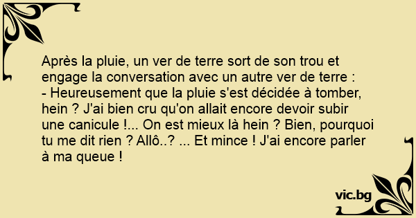 Après la pluie, un ver de terre sort de son trou et engage la conversation avec un autre ver de terre :