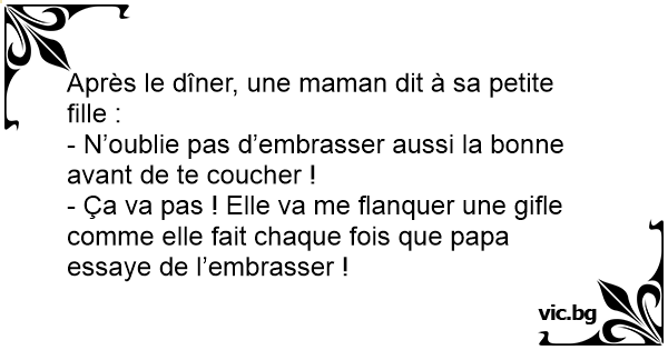 - Ça va pas ! Elle va me flanquer une gifle comme elle fait chaque fois que papa essaye de l’embrasser !