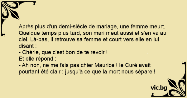 Après plus d'un demi-siècle de mariage, une femme meurt. Quelque temps plus таrd, son mari meut aussi et s'en va au ciel. Là-bas, il retrouve sa femme et court vers elle en lui disant :