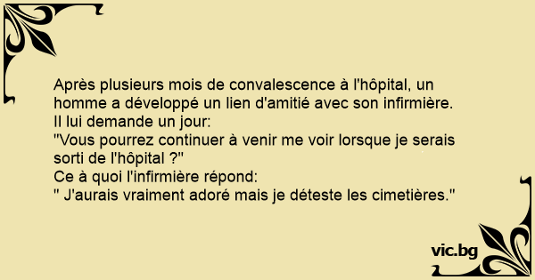 Un homme est à l'hôpital il dit à son infirmière : - Vous êtes mon infirmière préférée, Pourriez-vous venir me voir quand je serai sorti de l'hôpital ? - J'adorerais venir vous voir mais j'ai horreur des cimetières !!!