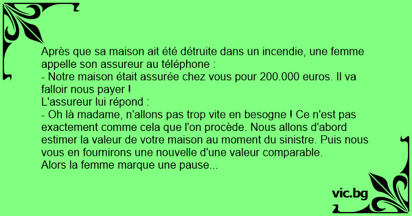 - Oh là madame, n'allons pas trop vite en besogne ! Ce n'est pas exactement comme cela que l'on procède. Nous allons d'abord estimer la valeur de votre maison au moment du sinistre. Puis nous vous en fournirons une nouvelle d'une valeur comparable.