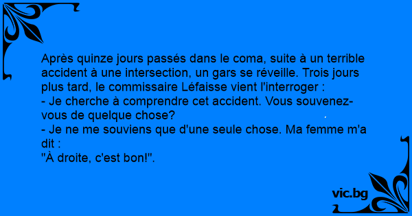 Après quinze jours passés dans le coma, suite à un terrible accident à une intersection, un gars se réveille. Trois jours plus таrd, le commissaire Léfaisse vient l'interroger :