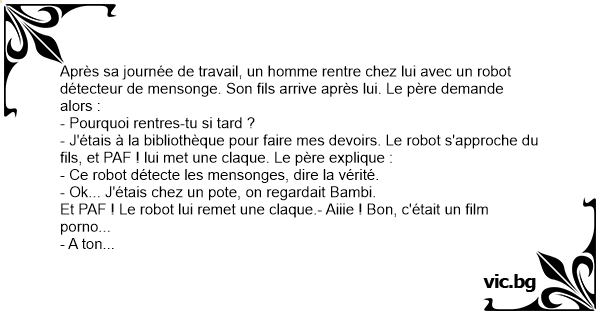 Un père ramène un robot détecteur de mensonge à la maison, qui gifle les gens quand ils mentent. Le soir au moment du repas en famille, il décide de le tester. - Fiston où étais-tu aujourd'hui ? - Bah à l'école papa. Le robot gifle le fils ! - Ok.. j'ai regardé un truc chez un pote. - Hmm et...