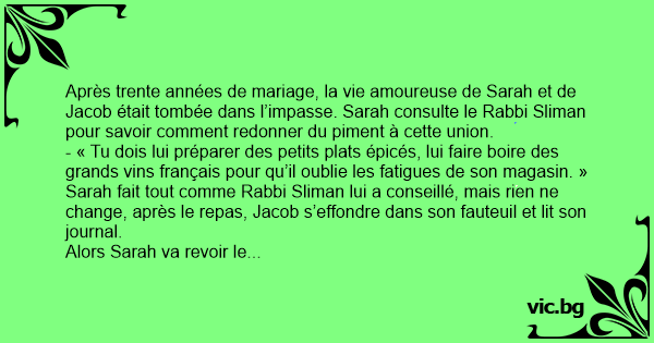 Après trente années de mariage, la vie amoureuse de Sarah et de Jacob était tombée dans l’impasse. Sarah consulte le Rabbi Sliman pour savoir comment redonner du piment à cette union.