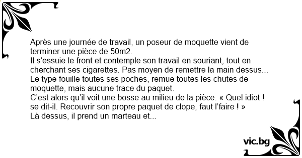 C’est alors qu’il voit une bosse au milieu de la pièce. « Quel idiот ! se dit-il. Recouvrir son propre paquet de clope, faut l’faire ! »