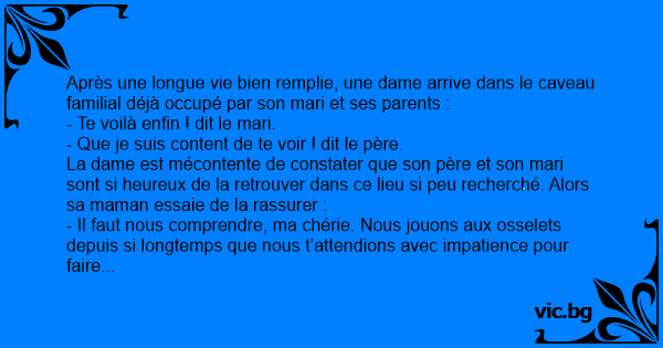 Après une longue vie bien remplie, une dame arrive dans le caveau familial déjà occupé par son mari et ses parents :