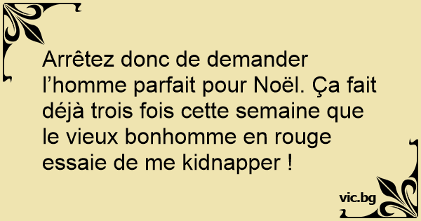 Arrêtez donc de demander l’homme parfait pour Noël. Ça fait déjà trois fois cette semaine que le vieux bonhomme en rouge essaie de me kidnapper !