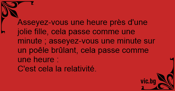 Asseyez-vous une heure près d'une jolie fille, cela passe comme une minute ; asseyez-vous une minute sur un poêle brûlant, cela passe comme une heure :