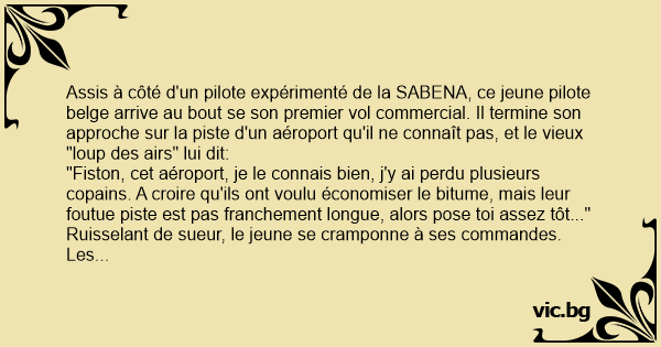 На международното летише Кенеди каца самолет на авиокомпания Балкан. Самолетът спира точно на трийсет сантиметра от края на пистата. В кабината единият пилот ядосано казва на другия: - Скиваш ли ги тия американци бе, Пешо. Нищо не им е като хората. Глей кви къси писти правят, а погледни колко е...