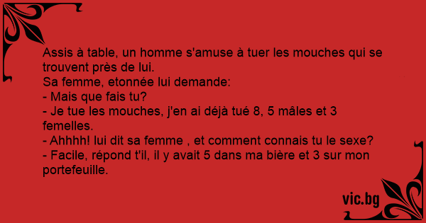 Муви Το φύλο вовочка говорит маме: - я сегодня 5 мух убил: 3 самца и 2 самки.... μύγες..." - Татко днес убих пет мухи - две женски и три мъжки. Una niña le dice a un niño: Der kleine Fritz sagt zu seiner Mutter: Une petite fille dit à un petit garçon : I stopped at a friend's house the other day and found him stalking around with a fly-swatter. — Сеня, шо ти бігаєш, як ідіот, з цією мухобійкою? — Роза, не заважай міні! Я вбив-таки п'ять мух... Три самці і дві самки! — Я тебе благаю! Як ти дізнався?! — А шо тут дізнаватися? Три — на банці з пивом, а дві — на телефоні... Sebastian kommt am frühen Morgen zu seiner Mama gelaufen: "Mama, ich habe gerade fünf Fliegen gefangen. Drei Weibchen und zwei Männchen." "Und wie hast Du gewusst, welche Männchen und welche Weibchen sind?", fragt ihn Mama. "Ganz einfach: Drei sind auf dem Spiegel gesessen und zwei auf der... A woman walked into the kitchen to find her husband stalking a round with a fly swatter. "What are you doing?" she asked. "Hunting flies," He responded. "Oh, killing any?" She asked. "Yep, three males, two females," he replied. Intrigued, she asked, How can you tell? He responded, "Three were on... “In questo luogo di villeggiatura ci sono tantissime mosche!” “Sì, ne ho appena uccise 8: 4 maschi e 4 femmine!” “Incredibile, ma come fai a distinguerle?” “Semplice: 4 erano su una bottiglia di grappa e 4 su uno specchio...!” En kvinna kommer hem och kliver in i köket och ser då sin man med flugsmällan i hösta hugg. Hon undrar: - Vad gör du? - Jag jagar flugor. - Har du haft ihjäl några då? - Jadå, tre hanar och två honor. Fascinerad undrar kvinnan: - Men hur ser du... Rozmawia Jasiu z dziadkiem. Dziadek mówi: - Wiesz co? Wczoraj do mojego domu wleciało pięć much. Trzy muchy-kobiety i dwie muchy płci męskiej. - A skąd to wiedziałeś? - No, bo trzy siedziały na... Une femme arrive dans la cuisine et voit son mari avec une tapette à mouche... - Que fais-tu ? Il répond : - Je chasse les mouches... - En as-tu tué ? - Oui, 3 mâles, 2 femelles Intriguée, elle lui... A woman came home to find her retired husband waving a rolled up newspaper round his head. Wife: 'What are you doing dear?' Husband: 'Swatting flies - I got 3 males and 2 females' Wife: 'How on... Een vrouw komt de keuken binnen en ziet haar man zwaaien met een vliegenmepper. "Wat doe je?" vraagt ze aan haar man. Hij antwoord: "Ik jaag op vliegen." "En hoeveel heb je er al gevangen?", vraagt... Jantje heeft twee vliegen gevangen en zegt tegen zijn moeder “Volgens mij is het een mannetje en een vrouwtje” Zijn moeder kijk verbaast en vraagt “Hoe kan je dat nou weten Jantje?” Waarop Jantje... A mulher chega em casa e vê o marido atarantado correndo pra lá e pra cá com um pano na mão. — O que é isso, querido? Ficou maluco? — Estou matando moscas, meu amor! Já matei cinco: duas machos e... Une femme rentre dans sa cuisine et y trouve son mari brandissant une tapette à mouche... Elle lui demande : - Mais qu'est-ce que tu fabriques ? - Ben, je chasse les mouches... - Et tu en as eu ? -... Comment faire la différence entre une mouche mâle et une mouche femelle ? La mouche mâle se pose sur ta bière et la mouche femelle sur le téléphone. Una vez estaba un gallego matando moscas y en eso llega su compadre y le pregunta: -¿Cuántas moscas llevas? -Seis hembras y cuatro machos. -¿Pero como sabes eso? -Es que cuatro estaban chupando en... Kadın eve geldiğinde kocasını mutfakta sinek öldürürken görür ve sorar: - Ne yapıyorsun hayatım? - Sinek yakalıyorum. - Öldürebildin mi bari? - Evet, 3 erkek ve 2 tane dişi sinek öldürdüm!... - Mamă! Am omorat cinci muşte dintr-o singură lovitură! povesteşte Bulă. Două erau masculi şi trei femele. - Cum ţi-ai dat seama de acest lucru? - Păi două erau pe masă şi trei pe oglindă. Kaimynas klausia kaimyno: - Ką veiki namie? - Muses gaudau, - atsako šis. - Tik ką užmušiau penkias: dvi vyriškos ir tris moteriškos giminės. - Iš kurgi tai žinai? - Dvi sėdėjo ant degtinės... Una mujer llega a casa y se encuentra al marido con un matamoscas en la mano. -¿ Qué haces? Él contesta: - Matando moscas. -¿ Y has matado alguna? -¡ Sí! ¡3 machos y 2 hembras! Intrigada ella le... A feleség bemegy a konyhába és meglátja a férjét egy légycsapóval. - Te meg mit csinálsz? Erre a férj: - Legyekre vadászom. - És mennyit ütöttél már le? - Három hímet és két nőneműt. A feleség... -¿ Qué haces? - Matando moscas. -¿ Has matado ya alguna? - Sí, cuatro machos y dos hembras. -¿ Y cómo lo sabes? - Porque cuatro estaban en el vaso de cerveza y dos en el espejo Konen kommer ud i køkkenet og finder manden spankulerende rundt med en fluesmækker. Konen: Hvad laver du? Manden: Jagter fluer. Konen: Nåh, har du fået ram på nogen? Manden stolt: Jep, 5 stk. 3... Жената влегува во кујна и го начекува мажот како стои со тепалка за муви во рацете и шета низ кујната. Што правиш? Тепам муви. Па утепа ли некоја? Да, пет машки три женски. Жената изнервирана: А...