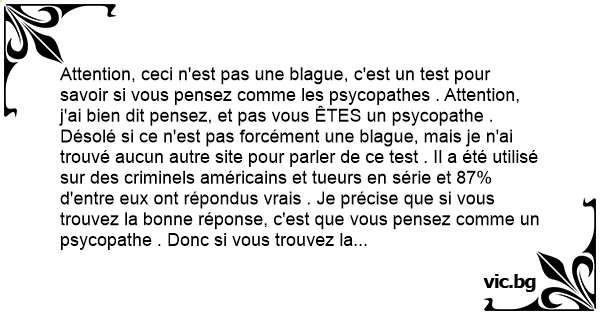 Attention, ceci n'est pas une blague, c'est un test pour savoir si vous pensez comme les psycopathes . Attention, j'ai bien dit pensez, et pas vous ÊTES un psycopathe . Désolé si ce n'est pas forcément une blague, mais je n'ai trouvé aucun autre site pour parler de ce test . Il a été utilisé sur des criminels américains et tueurs en série et 87% d'entre eux ont répondus vrais . Je précise que si vous trouvez la воnnе réponse, c'est que vous pensez comme un psycopathe . Donc si vous trouvez la mauvaise, vous êtes quelqu'un de normal .