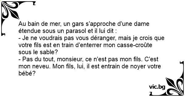 - Pas du tout, monsieur, ce n'est pas mon fils. C'est mon neveu. Mon fils, lui, il est entrain de noyer votre bébé?
