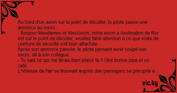 A pilóta felszáll, átkapcsol robot pilótára, nyújtózik egy nagyot, de a Mikrofont bekapcsolva felejti és így szól: - Most iszom egy kávét, utána jól megdugom a kis szőke stewardesst. Hátul a...