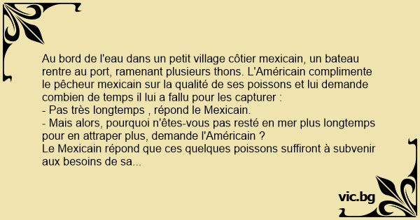 Au bord de l'eau dans un petit village côtier mexicain, un bateau rentre au port, ramenant plusieurs thons. L'Américain complimente le pêcheur mexicain sur la qualité de ses poissons et lui demande combien de temps il lui a fallu pour les capturer :