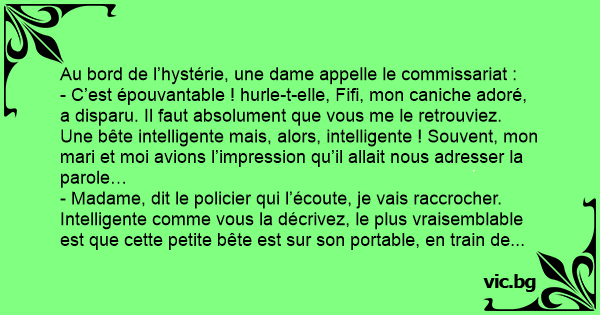 - C’est épouvantable ! hurle-t-elle, Fifi, mon caniche adoré, a disparu. Il faut absolument que vous me le retrouviez. Une bête intelligente mais, alors, intelligente ! Souvent, mon mari et moi avions l’impression qu’il allait nous adresser la parole…