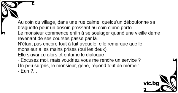 Le monsieur commence enfin à se soulager quand une vieille dame revenant de ses courses passe par là.
