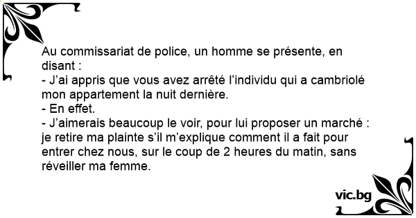 - J’aimerais beaucoup le voir, pour lui proposer un marché : je retire ma plainte s’il m’explique comment il a fait pour entrer chez nous, sur le coup de 2 heures du matin, sans réveiller ma femme.