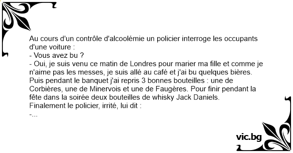 - Oui, je suis venu ce matin de Londres pour marier ma fille et comme je n'aime pas les messes, je suis allé au café et j'ai bu quelques bières. Puis pendant le banquet j'ai repris 3 bonnes bouteilles : une de Corbières, une de Minervois et une de Faugères. Pour finir pendant la fête dans la soirée deux bouteilles de whisky Jack Daniels.