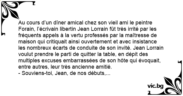 Au cours d’un dîner amical chez son vieil ami le peintre Forain, l’écrivain libertin Jean Lorrain fût très irrité par les fréquents appels à la vertu professés par la maîtresse de maison qui critiquait ainsi ouvertement et avec insistance les nombreux écarts de conduite de son invité. Jean Lorrain voulut prendre le parti de quitter la table, en dépit des multiples excuses embarrassées de son hôte qui évoquait, entre autres, leur très ancienne amitié.