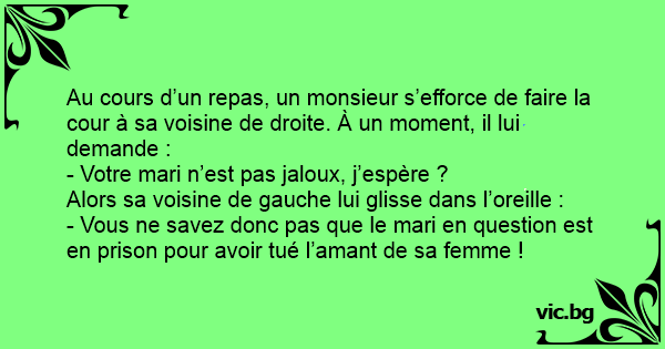 Au cours d’un repas, un monsieur s’efforce de faire la cour à sa voisine de droite. À un moment, il lui demande :