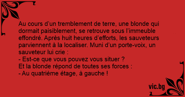 Au cours d’un tremblement de terre, une blonde qui dormait paisiblement, se retrouve sous l’immeuble effondré. Après huit heures d’efforts, les sauveteurs parviennent à la localiser. Muni d’un porte-voix, un sauveteur lui crie :
