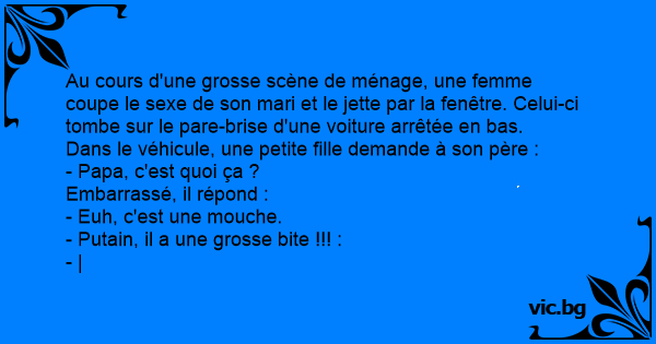 Au cours d'une grosse scène de ménage, une femme coupe le sexe de son mari et le jette par la fenêtre. Celui-ci tombe sur le pare-brise d'une voiture arrêtée en bas.