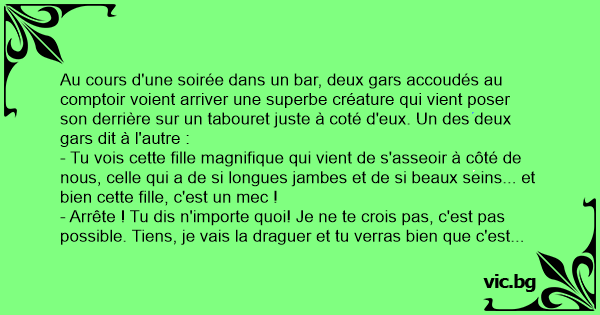 Au cours d'une soirée dans un bar, deux gars accoudés au comptoir voient arriver une superbe créature qui vient poser son derrière sur un tabouret juste à coté d'eux. Un des deux gars dit à l'autre :