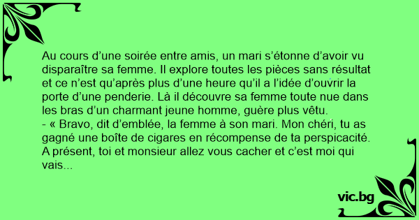 - « Bravo, dit d’emblée, la femme à son mari. Mon chéri, tu as gagné une boîte de cigares en récompense de ta perspicacité. A présent, toi et monsieur allez vous cacher et c’est moi qui vais vous chercher. »