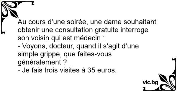 Au cours d’une soirée, une dame souhaitant obtenir une consultation gratuite interroge son voisin qui est médecin :