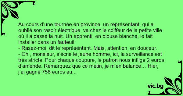 - Oh , monsieur, s’écrie le jeune homme, ici, la surveillance est très stricte. Pour chaque coupure, le patron nous inflige 2 euros d’amende. Remarquez que ce matin, je m’en balance… Hier, j’ai gagné 756 euros au Loto.