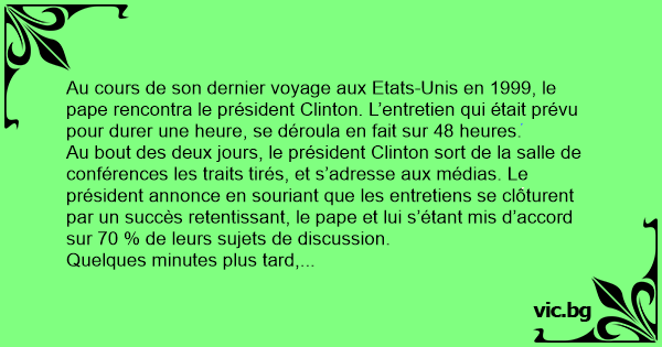 - Votre Sainteté, le président Clinton vient de nous dire que les entretiens avaient été fructueux et que vous étiez tombés d’accord sur 70% des sujets…