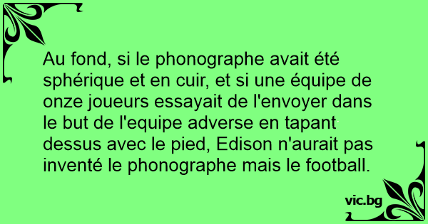 Au fond, si le phonographe avait été sphérique et en cuir, et si une équipe de onze joueurs essayait de l'envoyer dans le but de l'equipe adverse en tapant dessus avec le pied, Edison n'aurait pas inventé le phonographe mais le football.