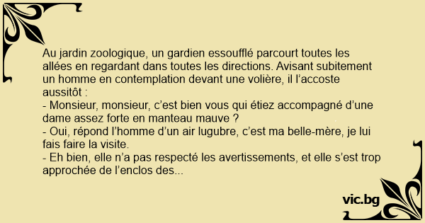Au jardin zoologique, un gardien essoufflé parcourt toutes les allées en regardant dans toutes les directions. Avisant subitement un homme en contemplation devant une volière, il l’accoste aussitôt :