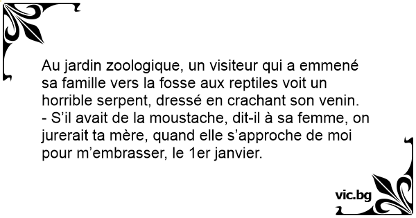 - S’il avait de la moustache, dit-il à sa femme, on jurerait ta mère, quand elle s’approche de moi pour m’embrasser, le 1er janvier.